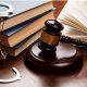 female lawyer in suit at workplace with laptop, gavel and femida in office